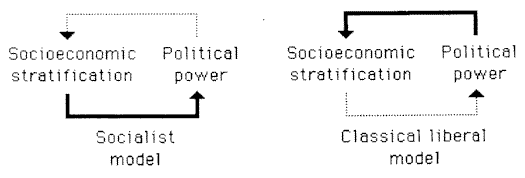 I think there are good reasons to accept the classical liberal model. Political power magnifies the influence of the wealthy, thus turning them into a powerful élite (see my “Who’s the Scrooge,” Formulations, Vol. I, No. 2, and “The Decline and Fall of Private Law in Iceland,” Formulations, Vol. I, No. 3); but in the absence of a state, competition would serve to keep such power in check. I would thus draw a strong arrow from political power to socioeconomic stratification, but only a weak arrow from socioeconomic stratification to political power.